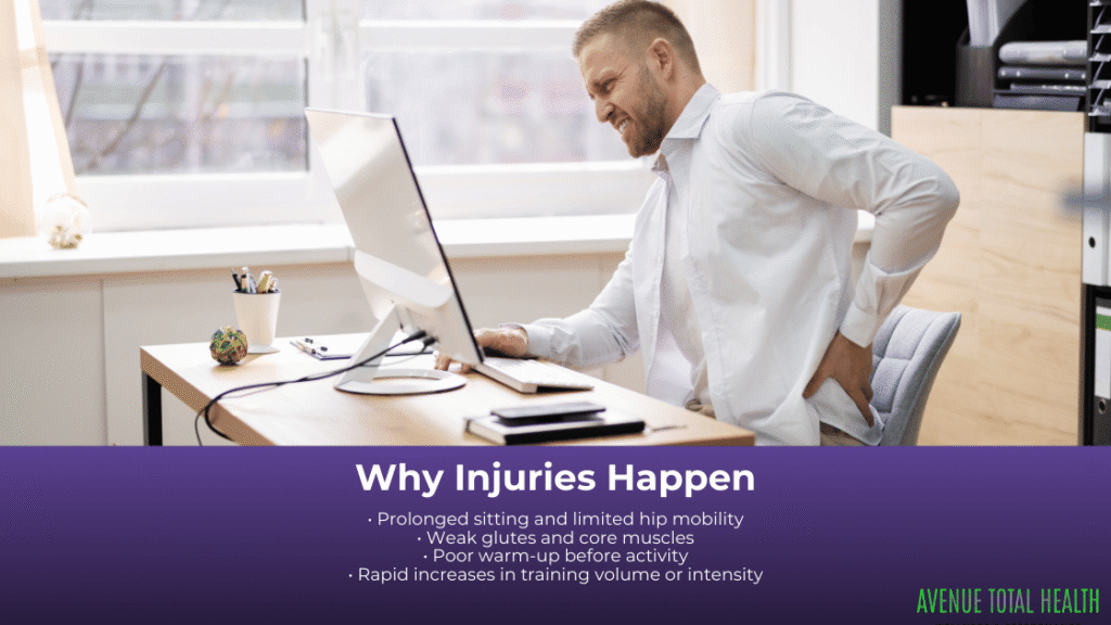 Hip injuries often occur when the joint is asked to handle forces it’s not prepared for. Common contributing factors include: